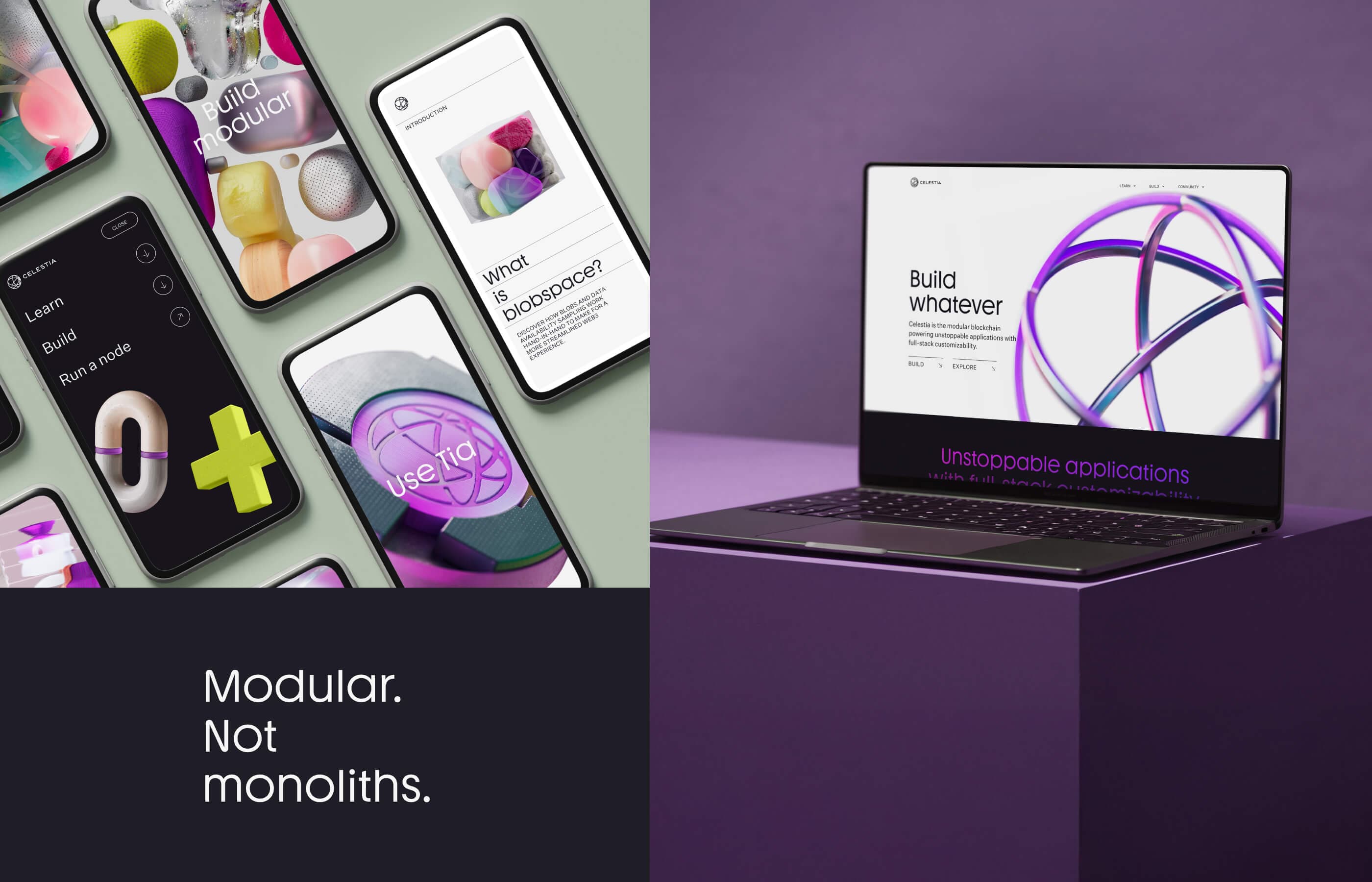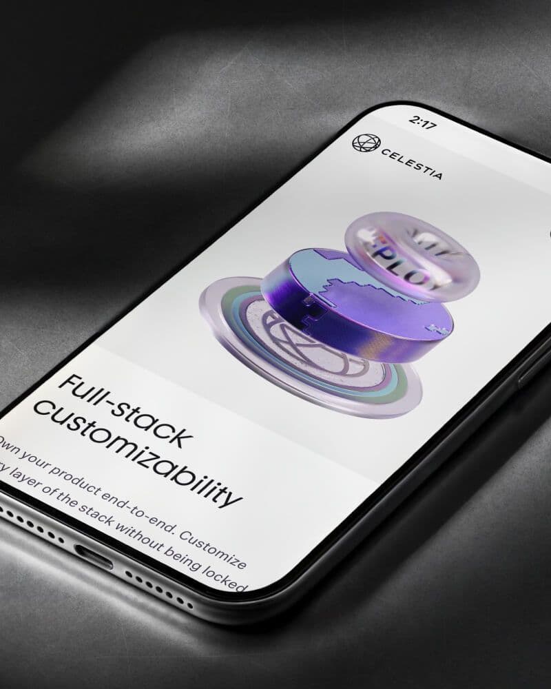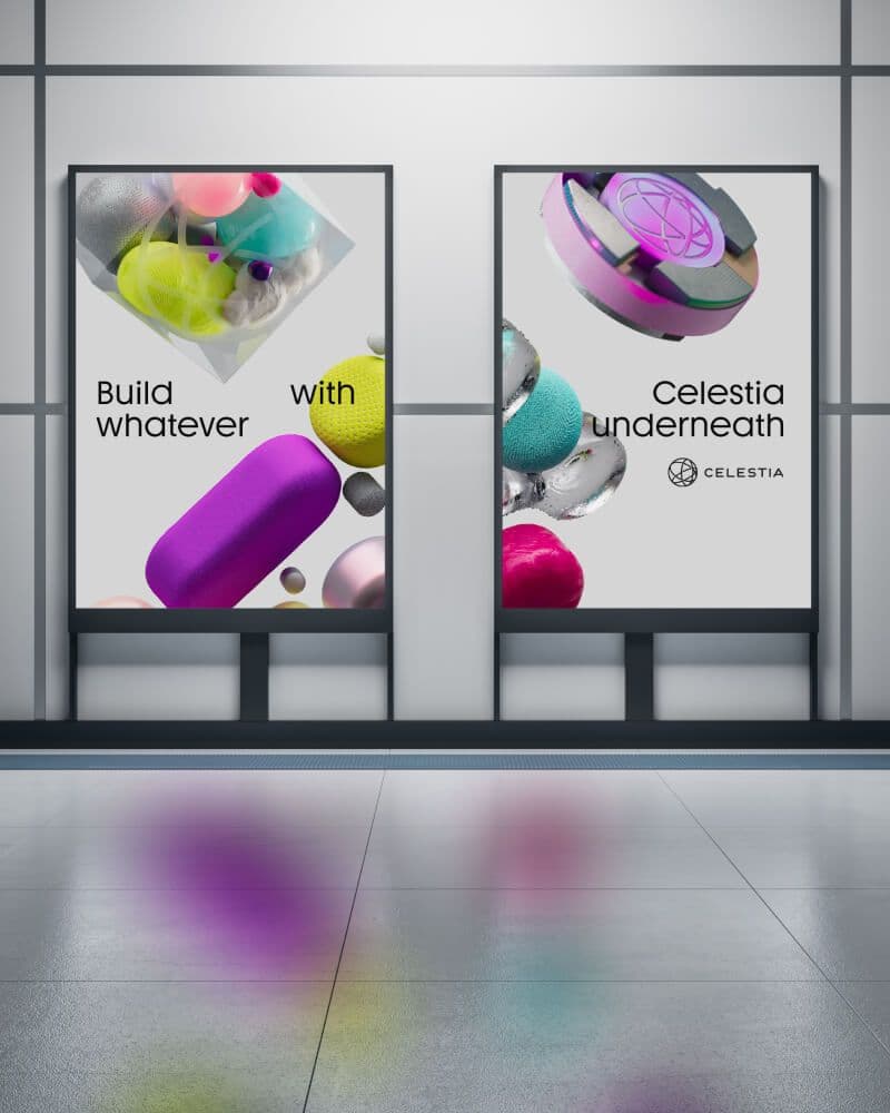 The brand features key assets to spotlight Celestia's unique capabilities in the blockchain world - from modularity to data availability and beyond. We kept it simple - market the logo but bring it to life in three-dimensional ways.